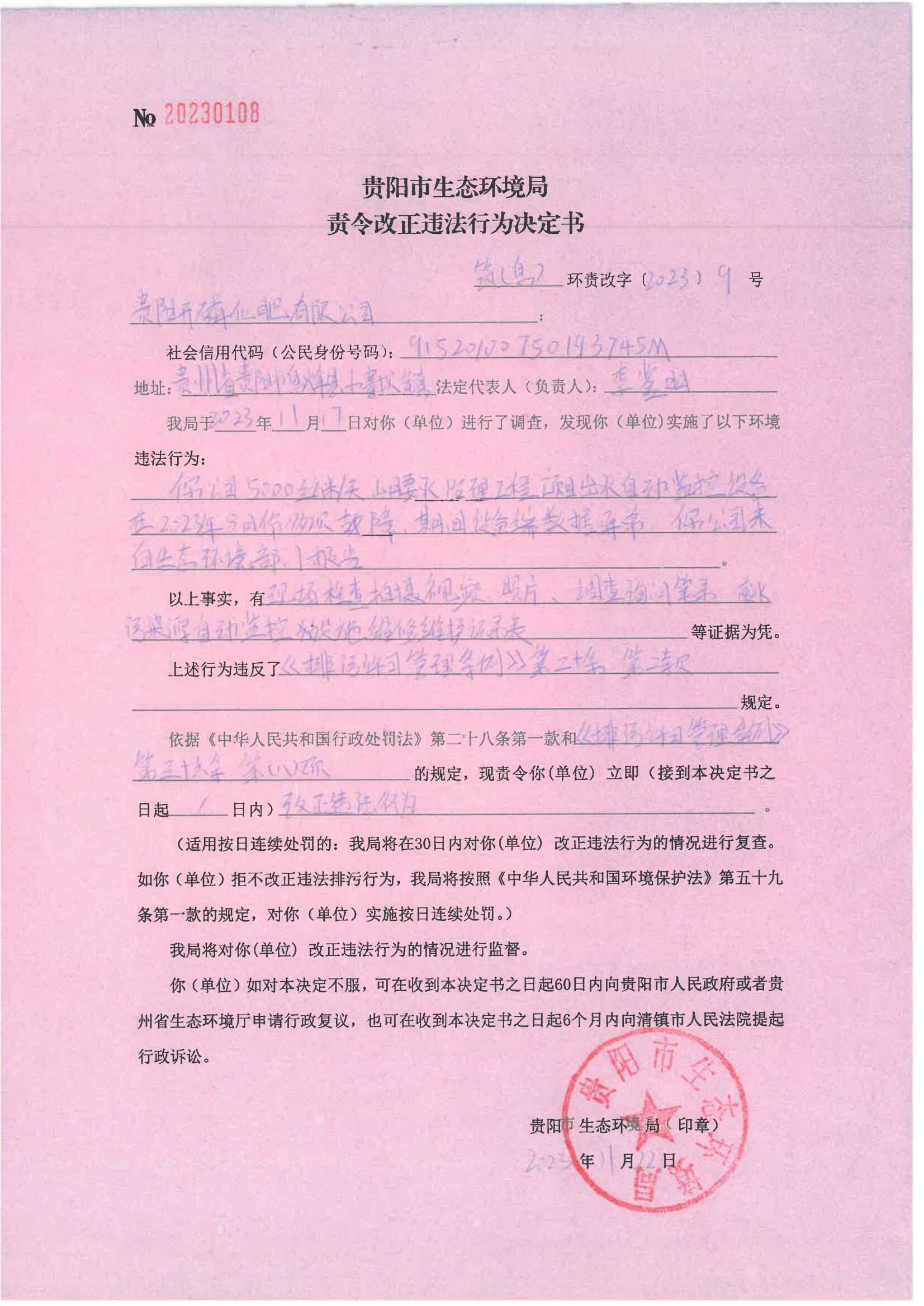 • 信息名称: 筑(息)环责改字〔2023〕9号 贵阳开磷化肥有限公司责令改正违法行为决定书