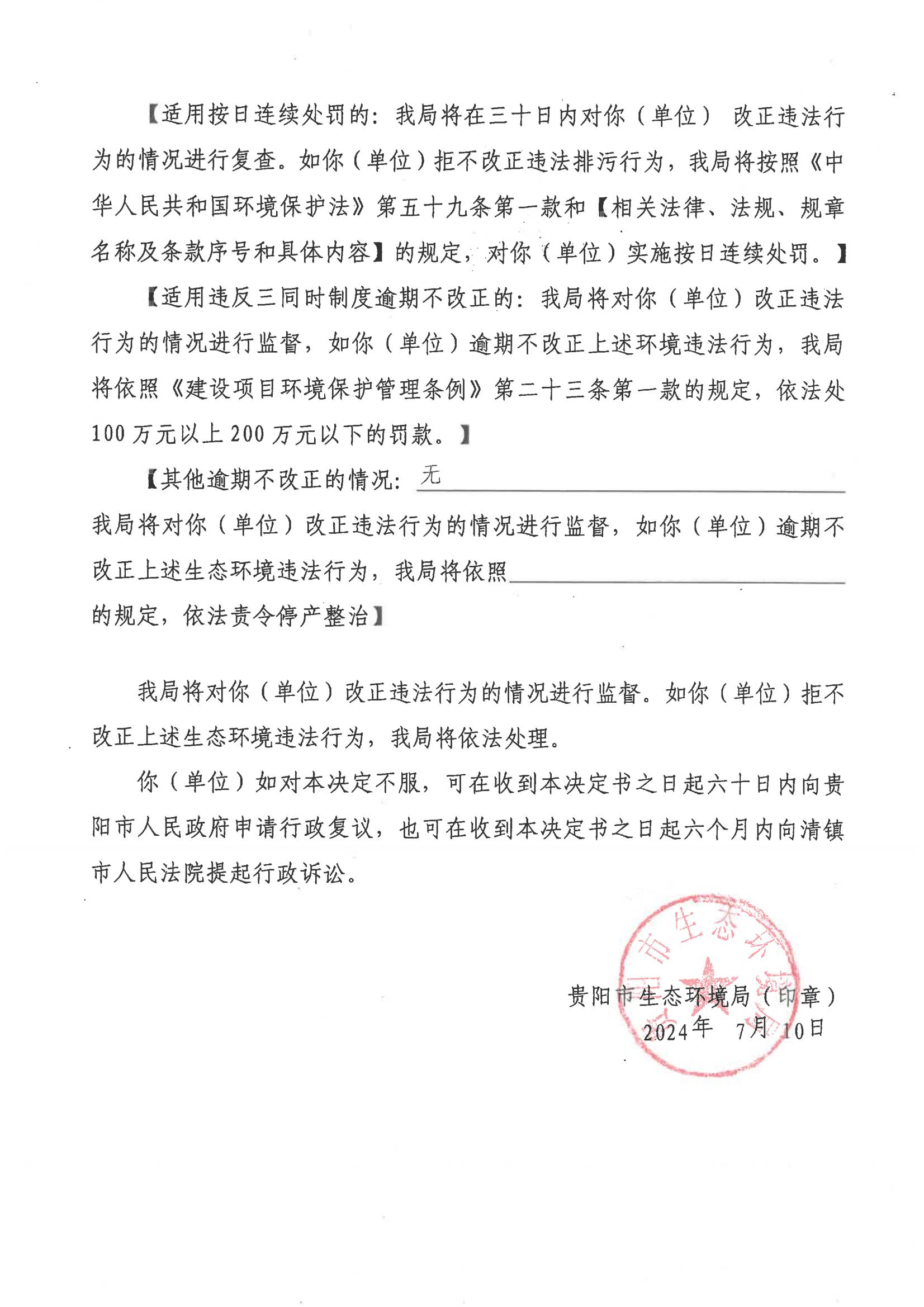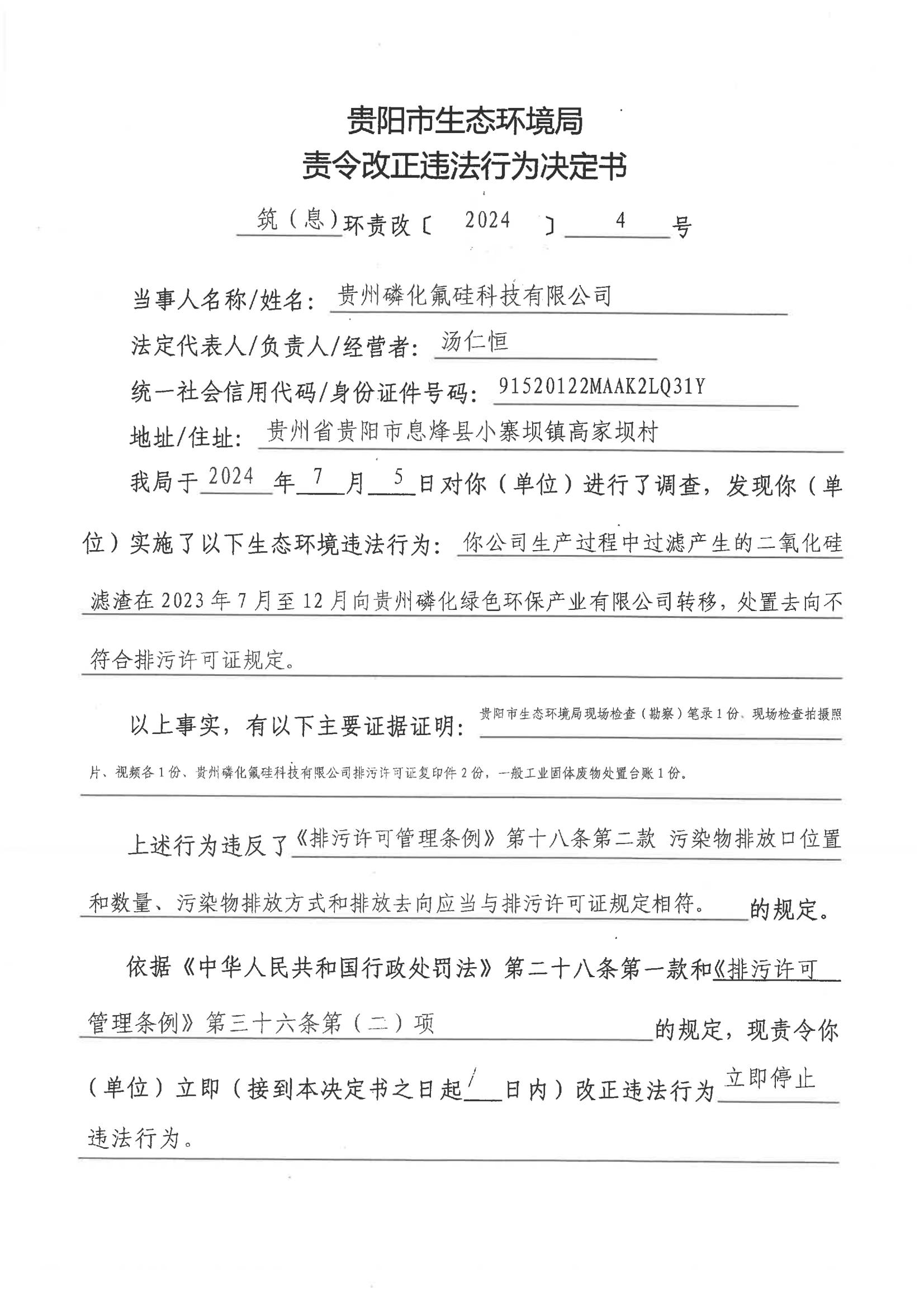 贵州磷化氟硅科技有限公司责令改正违法行为决定书