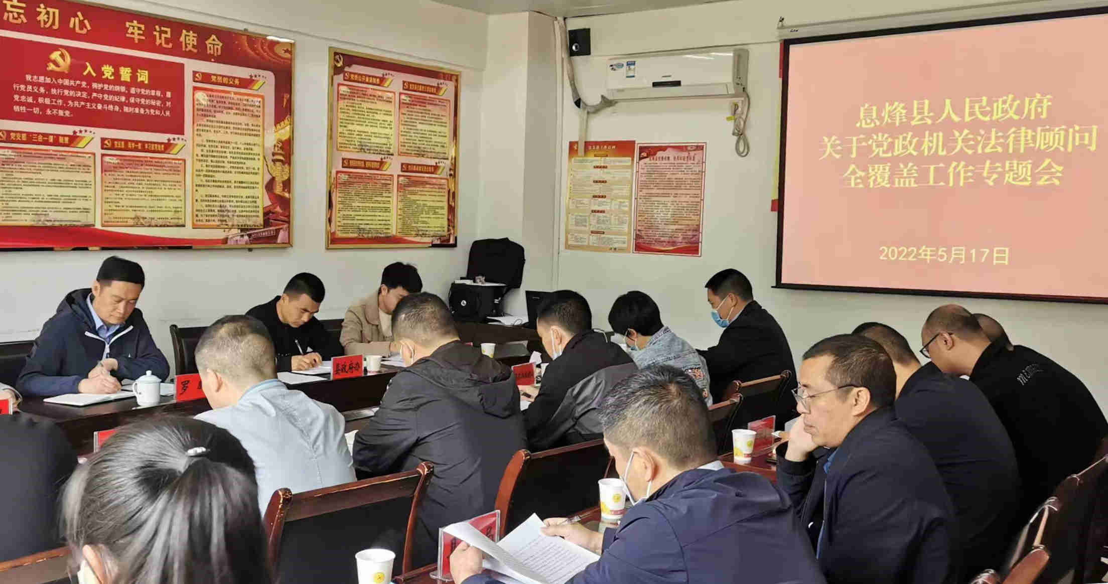 为进一步推动息烽县法治政府建设工作,充分发挥法律顾问的作用,提高依法执政、依法行政和依法办事的能力和水平,深入贯彻落实党政机关法律顾问全覆盖的要求。2022年5月17日,息烽县组织召开党政机关法律顾问全覆盖工作专题会议。