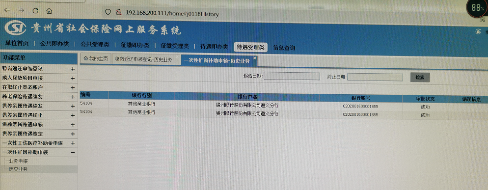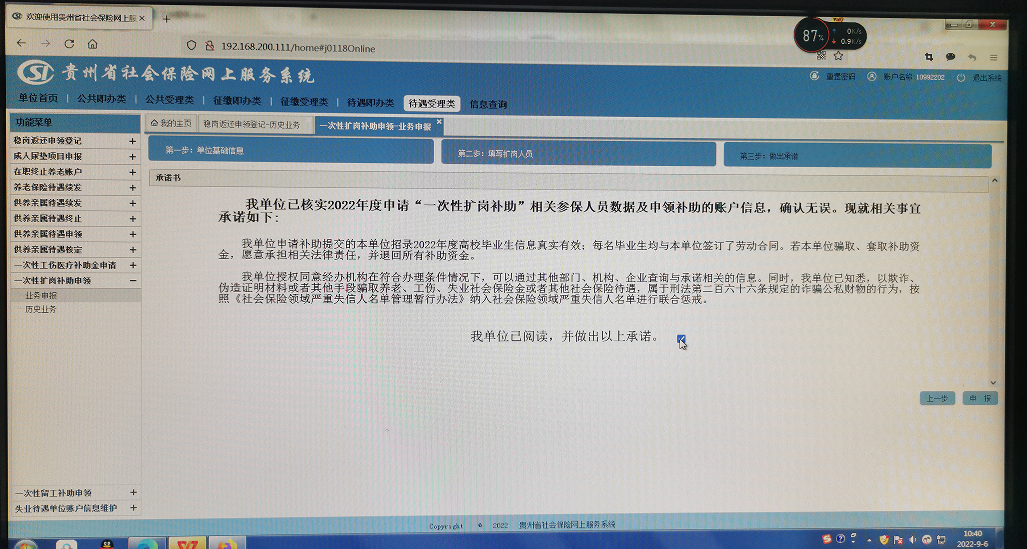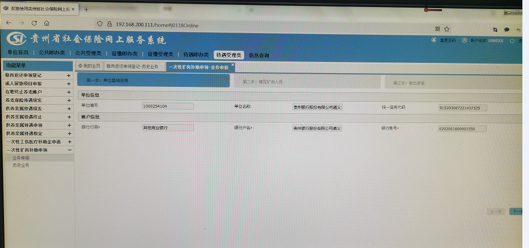 企业招用2022年度高校毕业生,签订劳动合同并参加失业保险的,可按每招一人1500元标准,发放一次性扩岗补助。与一次性吸纳就业补贴政策不重复享受。本条政策实施期限截至2022年年底。详情请咨询:87716297 进入网厅路径为:“待遇受理类”——“功能菜单”——“一次性扩岗补助申领”——“业务申报”一、确认账户信息,账户信息无误后可进入下一环节;如单位账户信息缺失或需要修改的可以根据提示信息进行填报,账户信息填报后需经办机构审核后方可进行一次性扩岗补助下一步申领。 二、确认扩岗人员信息。因信息比对有延迟,因此展示数据可能与单位实际招用人数确有出入,因此请各参保单位关注参保地经办机构信息发布,如2022年12月份后仍有符合条件人员未申领方可线下办理,2022年12月份之前原则上不受理线下申领。 路径为:“待遇受理类”——“功能菜单”——“一次性扩岗补助申领”——“历史业务”审核状态显示为“成功”即为申报成功,等待经办机构审核即可。